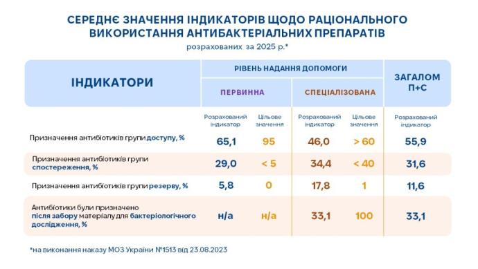 Узагальнені показники демонструють частоту призначень антибіотиків за класифікацією AWaRe (доступ, спостереження, резерв), а також відображають своєчасність проведення бактеріологічних досліджень для ідентифікації збудника інфекції й вибору правильного препарату.